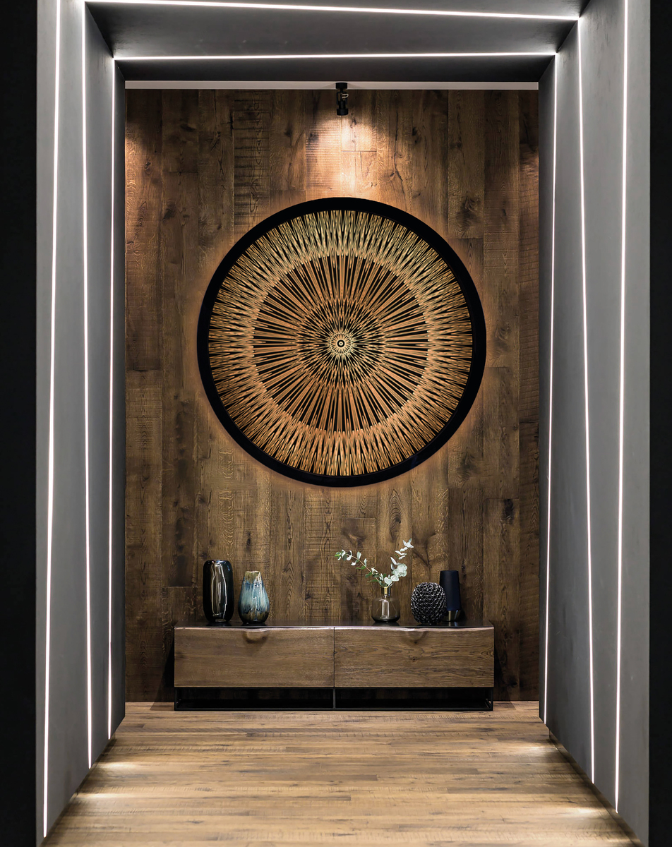 Medium: Automotive paints, acrylic paints, clear cast acrylic, epoxy resin, clear coat, custom board, 2-way glass, mirror, LEDs, 24v power supply, electrical cable, 240v plug.