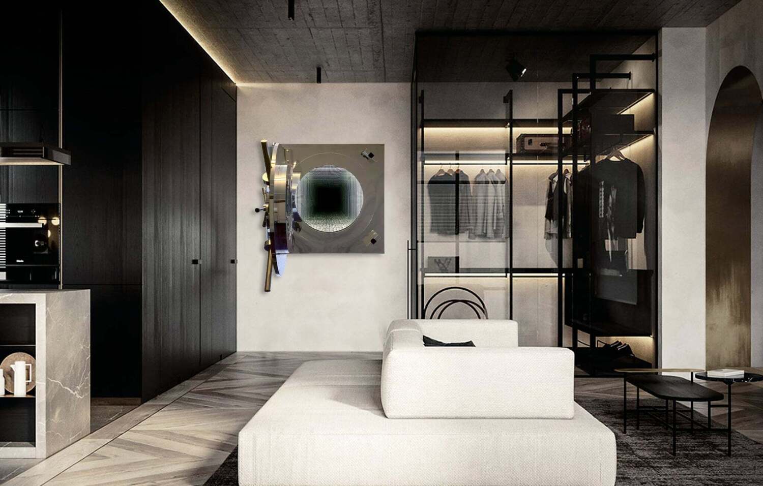 Medium: Mixed media sculpture with metal, mirrored glass, crystals and LED lighting